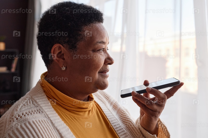 Пожилая женщина записывает голосовое сообщение через смартфон