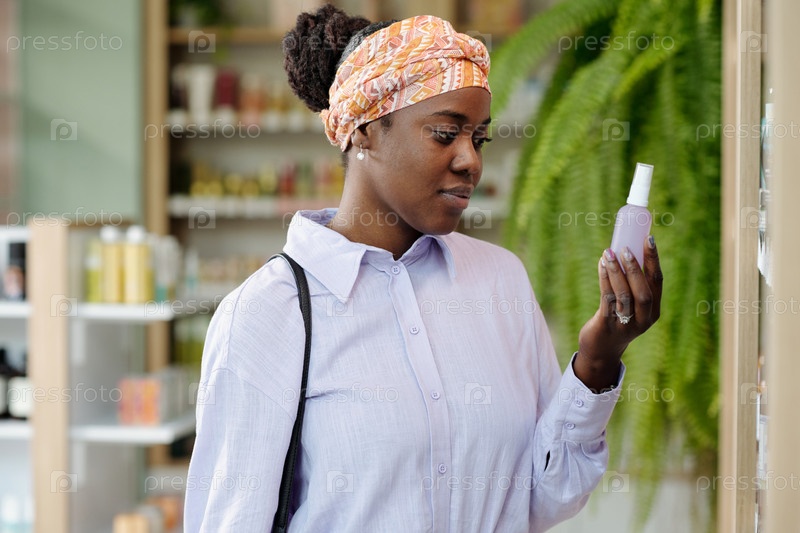 Красивая молодая женщина в головной повязке и синей рубашке выбирает средства красоты