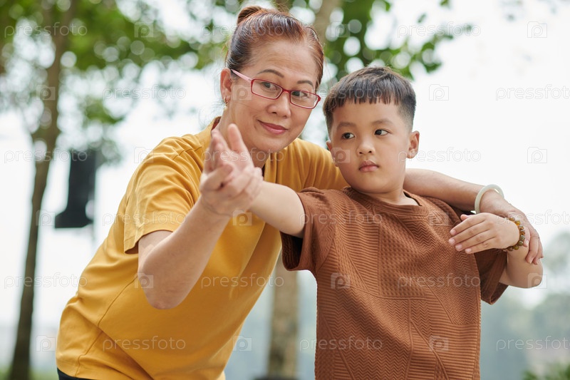 Бабушка и внук занимаются спортом