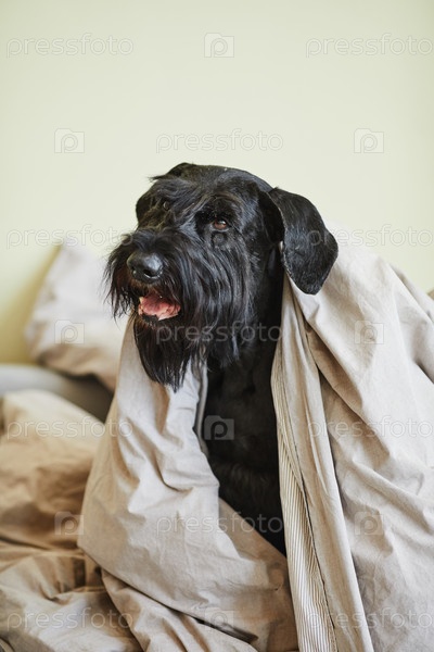 Черный шнаузер сидит на кровати под одеялом