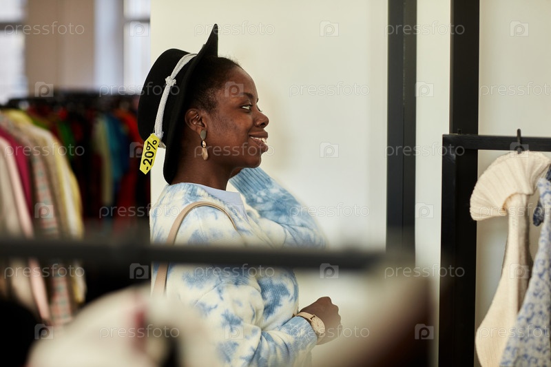 Улыбающаяся чернокожая женщина пытается надеть шляпу в магазине подержанных товаров