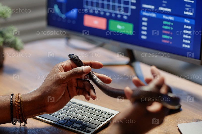 Руки молодого афроамериканского аналитика или брокера, держащего змею