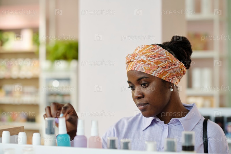 Молодая женщина в повязке на голове стоит перед большим дисплеем с продуктами красоты
