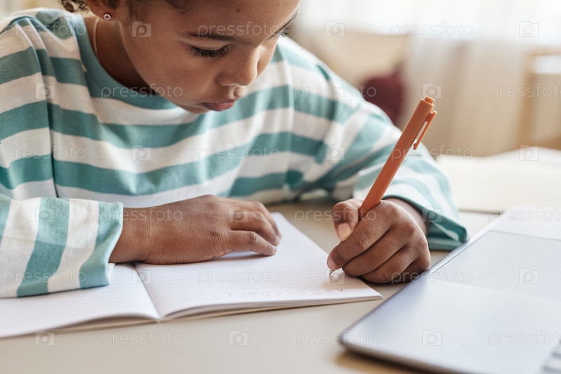 Черная девушка пишет в блокноте, делая домашнее задание за столом