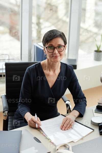 Элегантная зрелая деловая женщина, улыбающаяся на камеру и сидящая за столом в офисе
