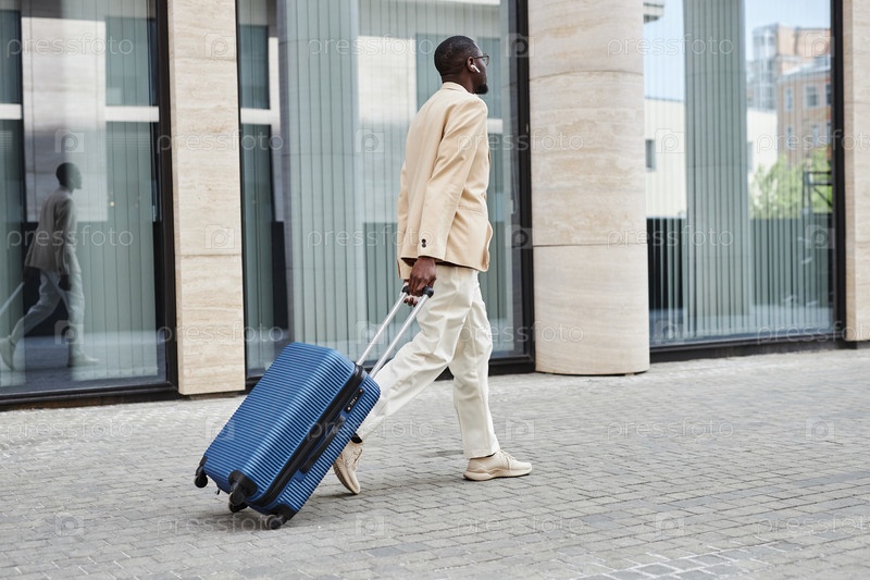 Задний вид молодого бизнесмена в формальной одежде, тянущего чемодан с багажом