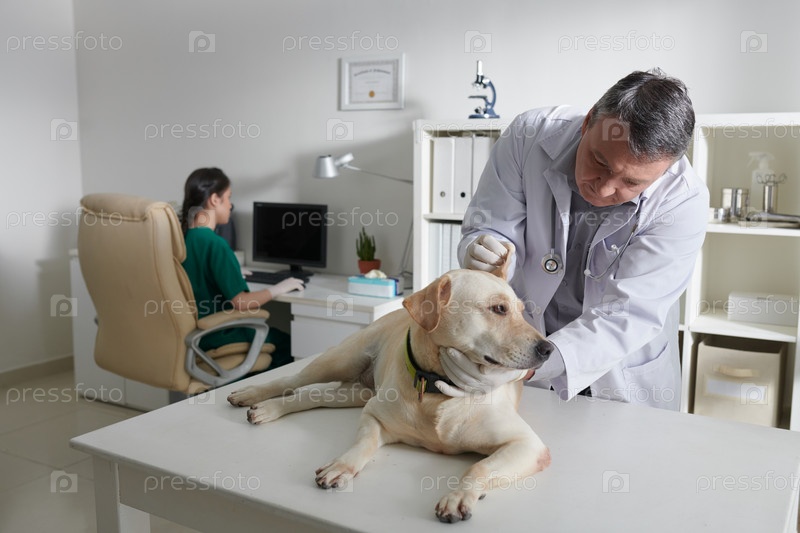 Ветеринар проверяет уши собаки
