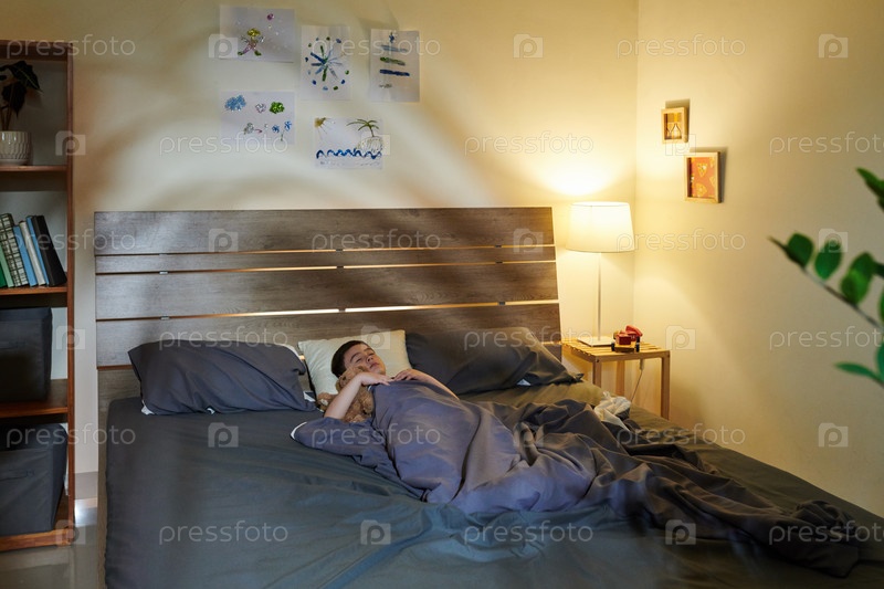 Десятилетний мальчик спит с тедди-медведем Pretty