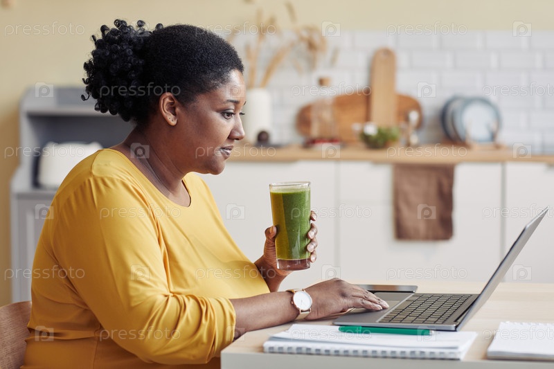 Чёрная женщина с избыточным весом использует лаптоп для бокового просмотра