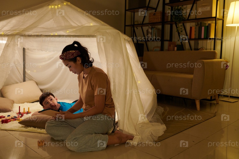 Беспокойный мальчик смотрит на чтение матери