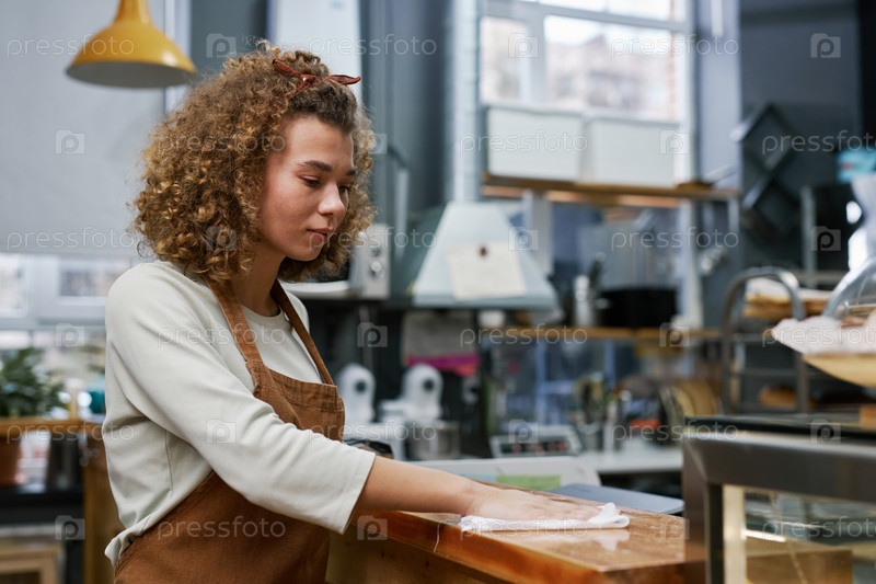 Работающий в пекарне убирает прилавок