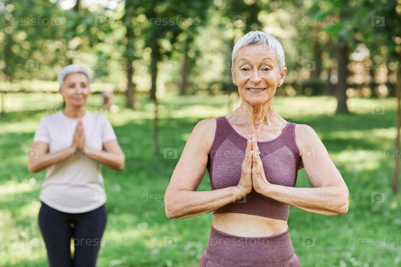 Активная пожилая женщина, наслаждающаяся йогой на свежем воздухе и улыбаясь