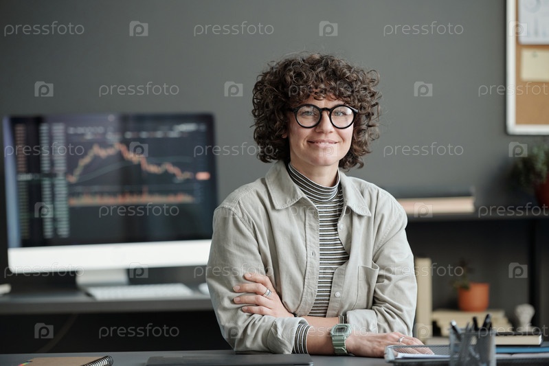 Молодая кудрявая брюнетка бизнес-леди в повседневной одежде и очках