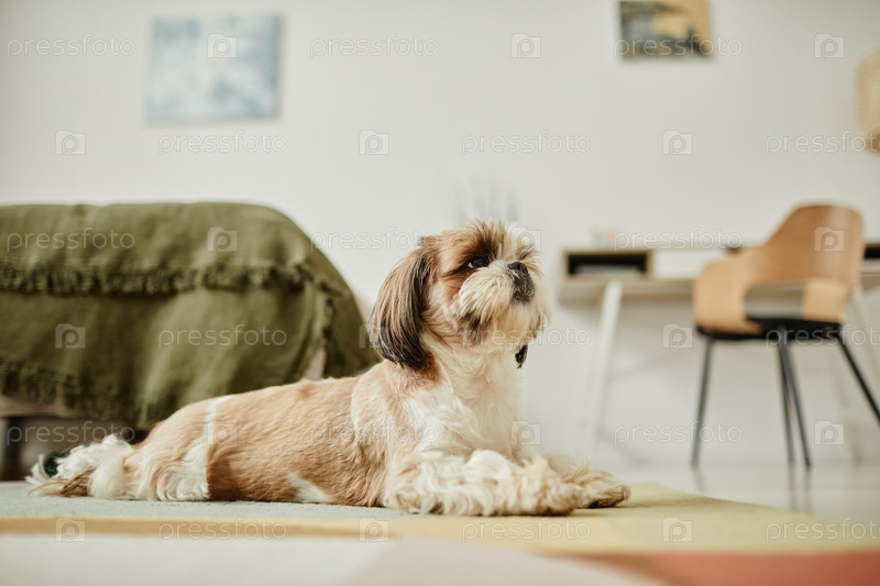 Боковый вид милая собака Ши-Цу, лежащая на ковре в уютном доме