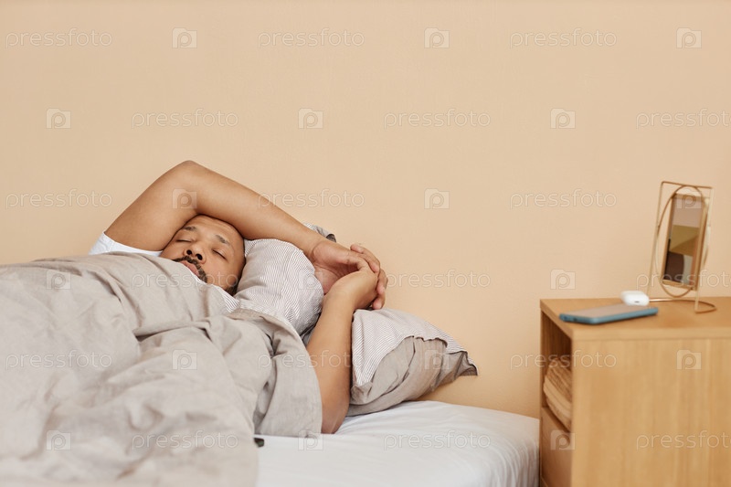 Взрослый чернокожий мужчина спит в удобной кровати дома