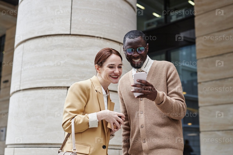 Два веселых коллеги в тихой роскошной одежде смотрят на экран смартфона