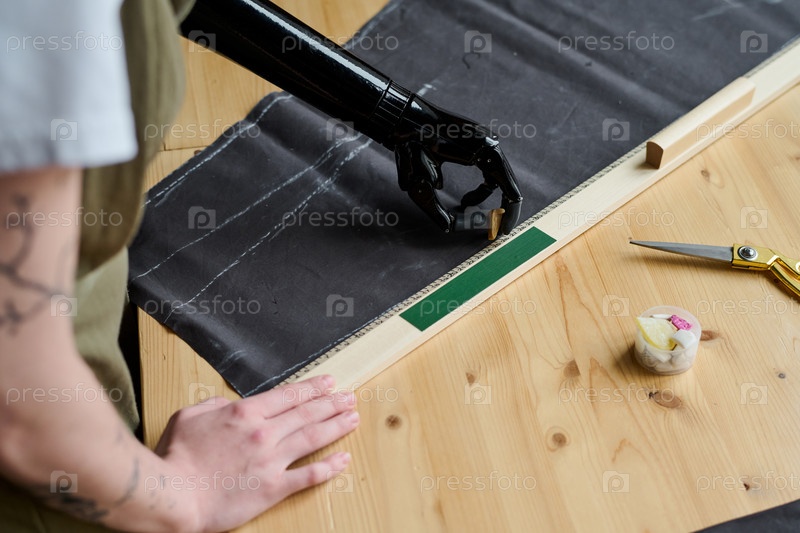 Над углом протеза черной руки дизайнера женской моды или портного