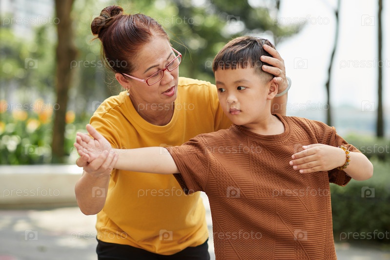 Бабушка учит внука упражнениям