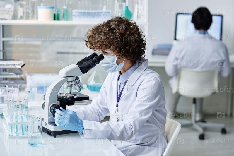 Молодая женщина в лаборанте, защитной маске и перчатках смотрит под микроскопом