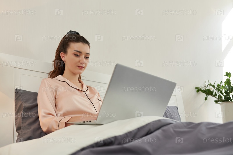 Молодая женщина, работающая в постели
