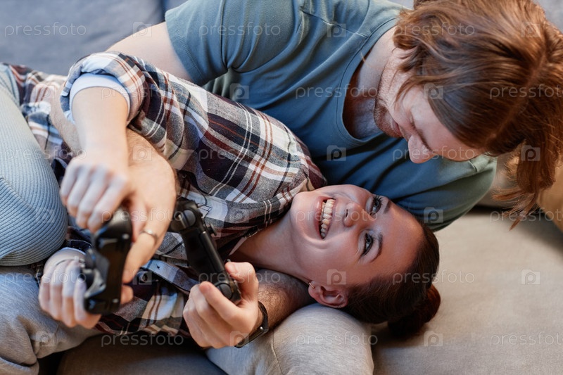 Близкий снимок игривой молодой пары, играющей в видеоигры вместе