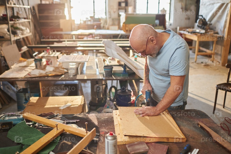 Старший ремесленник строит деревянную мебель в столярной мастерской