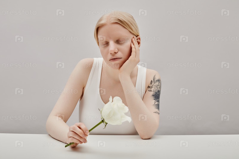 Девушка с альбинизмом держит белую розу минимально