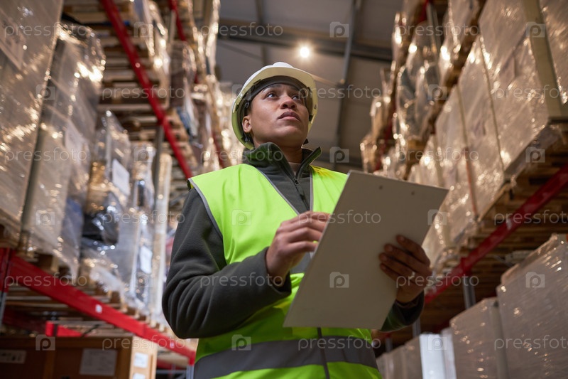 Чернокожая женщина на складе, держащая клипборд