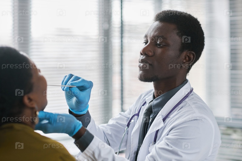 Молодой чернокожий врач консультирует пациента в клинике, проводящей обследование горла на грипп
