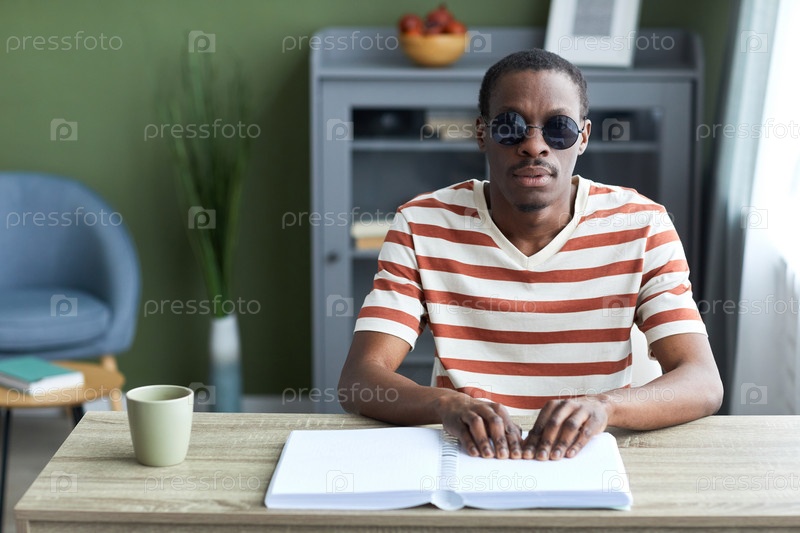 Слепой читает книгу дома