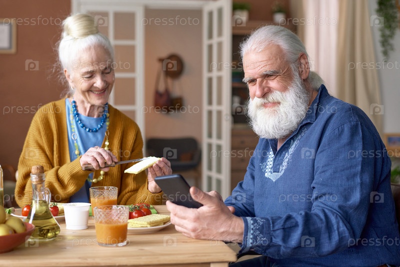 Дедушка и бабушка проводят видеозвонки на смартфоне
