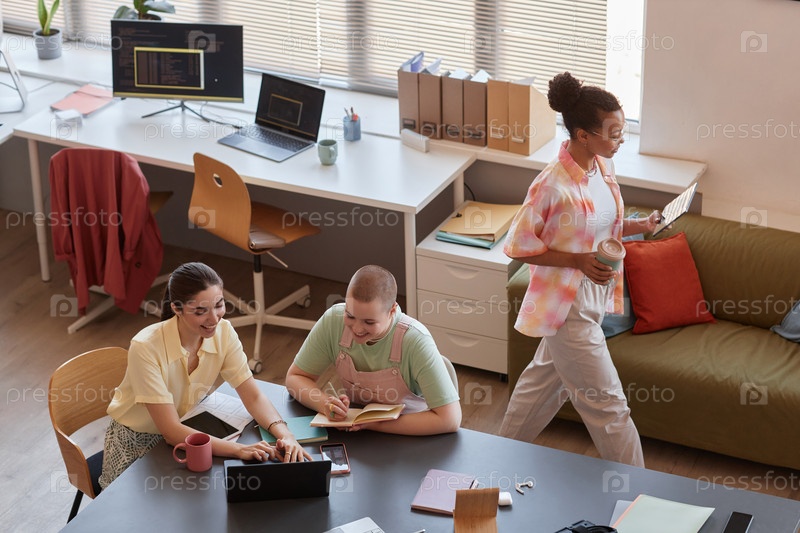 Процесс работы в офисе со всей женской бизнес-командой в розовых тонах