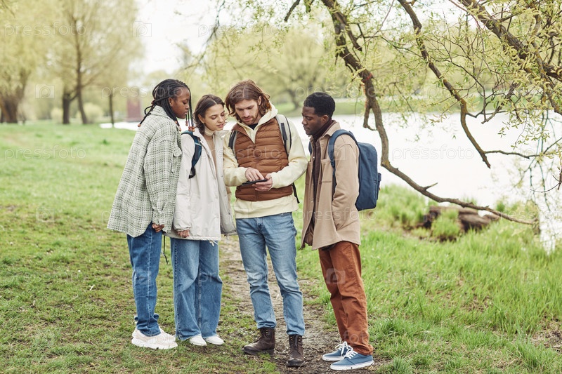 Подростки используют планшетный компьютер, чтобы найти дорогу