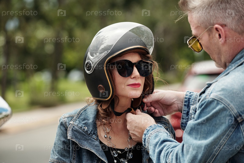 Парень помогает девушке надеть шлем