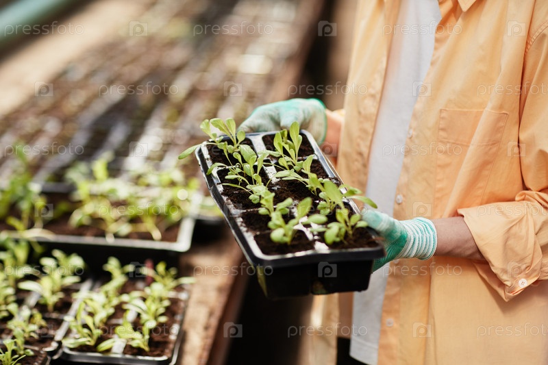 Молодая огородница в перчатках и рубашке, держащая саженцы