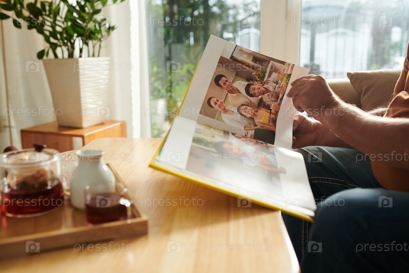 Пожилой мужчина смотрит на фотографии в альбоме