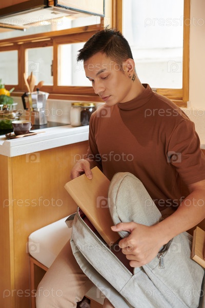 Студент, кладущий книги в рюкзак