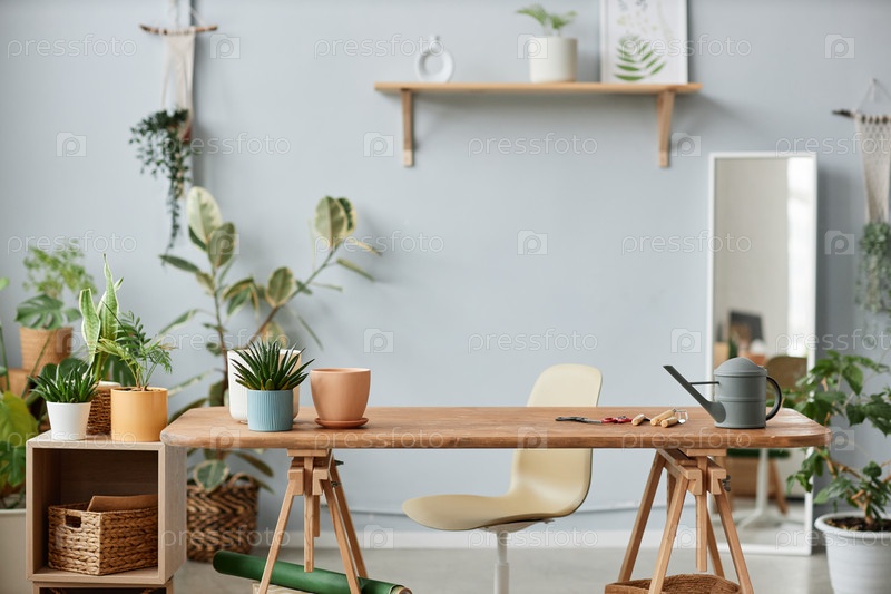 Садоводы работают в помещении с живыми растениями и деревянным столом