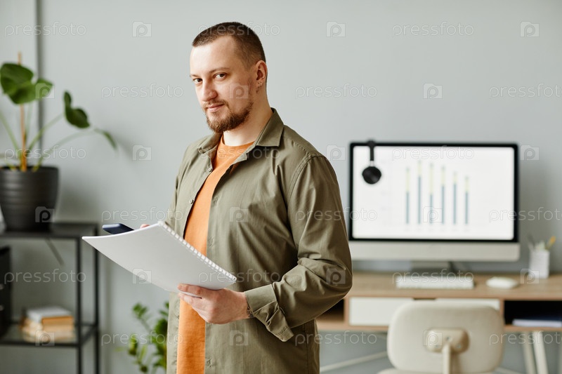Мужчина стоит в минимальном офисе и держит документ