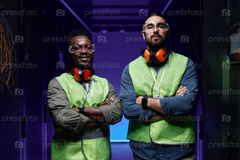 Два технических специалиста стоят в серверной комнате со скрещенными руками и смотрят на камеру