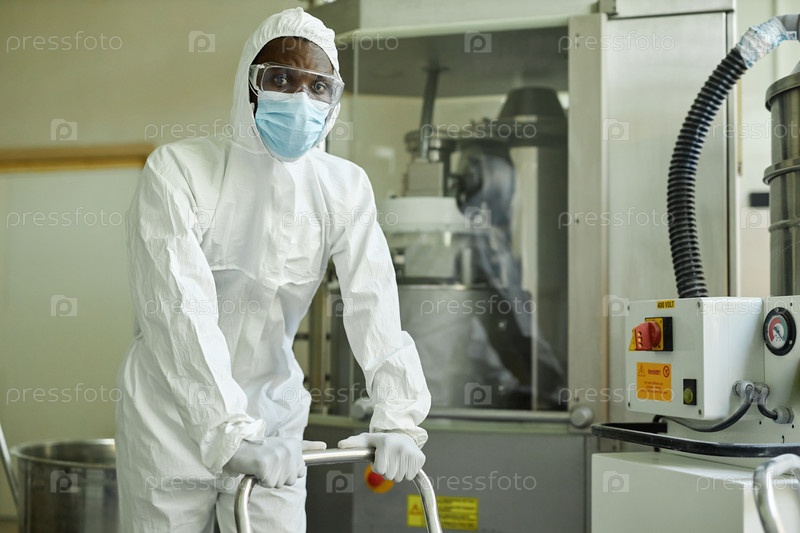 Чернокожий мужчина в маске и защитном костюме на фармацевтической фабрике