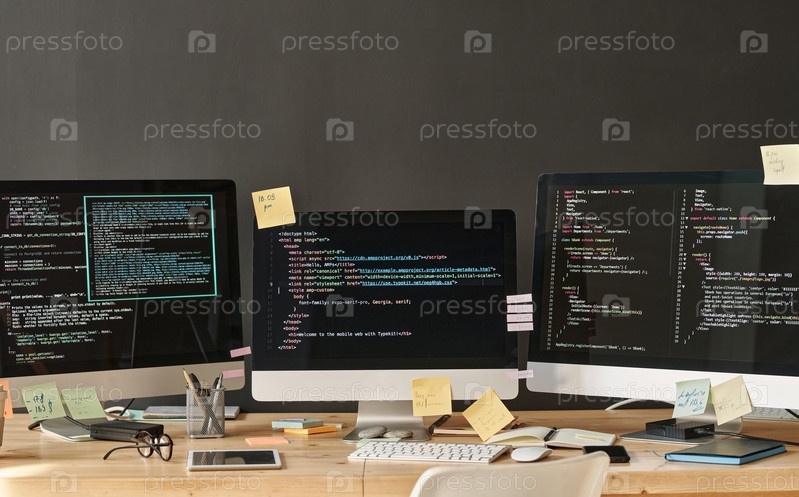 Ряд из трех компьютерных мониторов с зашифрованными данными на экранах, стоящих на столе