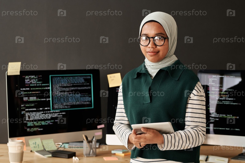 Молодой успешный мусульманский ИТ-инженер или разработчик программного обеспечения с планшетом