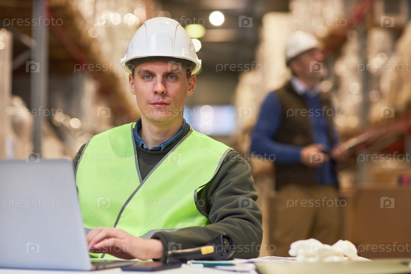 Улыбающийся молодой работник, использующий ноутбук на складе и смотрящий в камеру