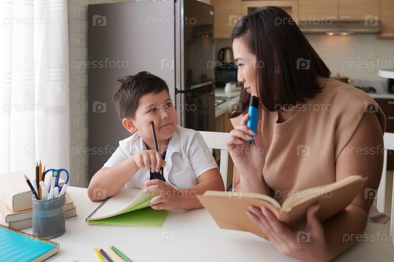 Мать помогает сыну с домашними заданиями