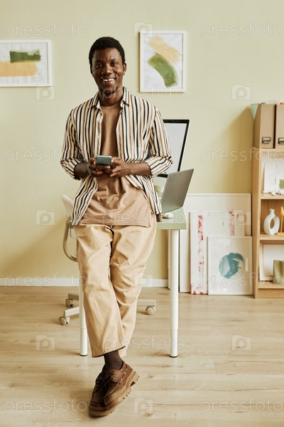Счастливый молодой креативный фрилансер в повседневной одежде с помощью смартфона