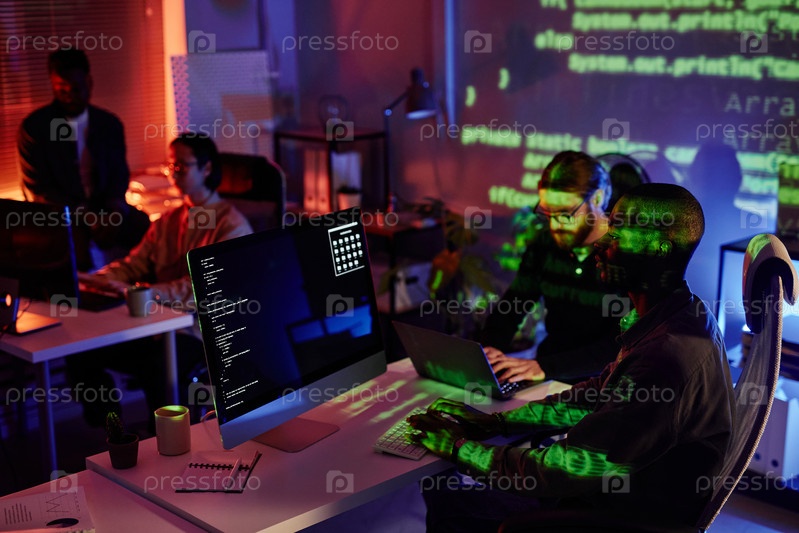 Группа молодых межкультурных коллег, сидящих за столами перед компьютерами