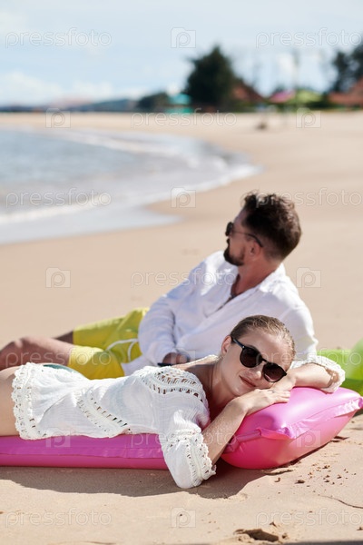 Пара отдыхает на плавучих матрасах