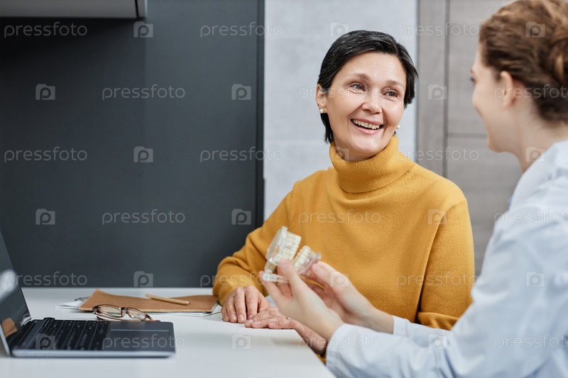 Улыбающаяся зрелая женщина разговаривает с зубным врачом в стоматологической клинике