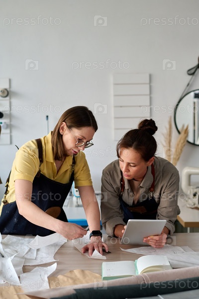 Зрелая портная и ее подчиненный склоняются над рабочим местом